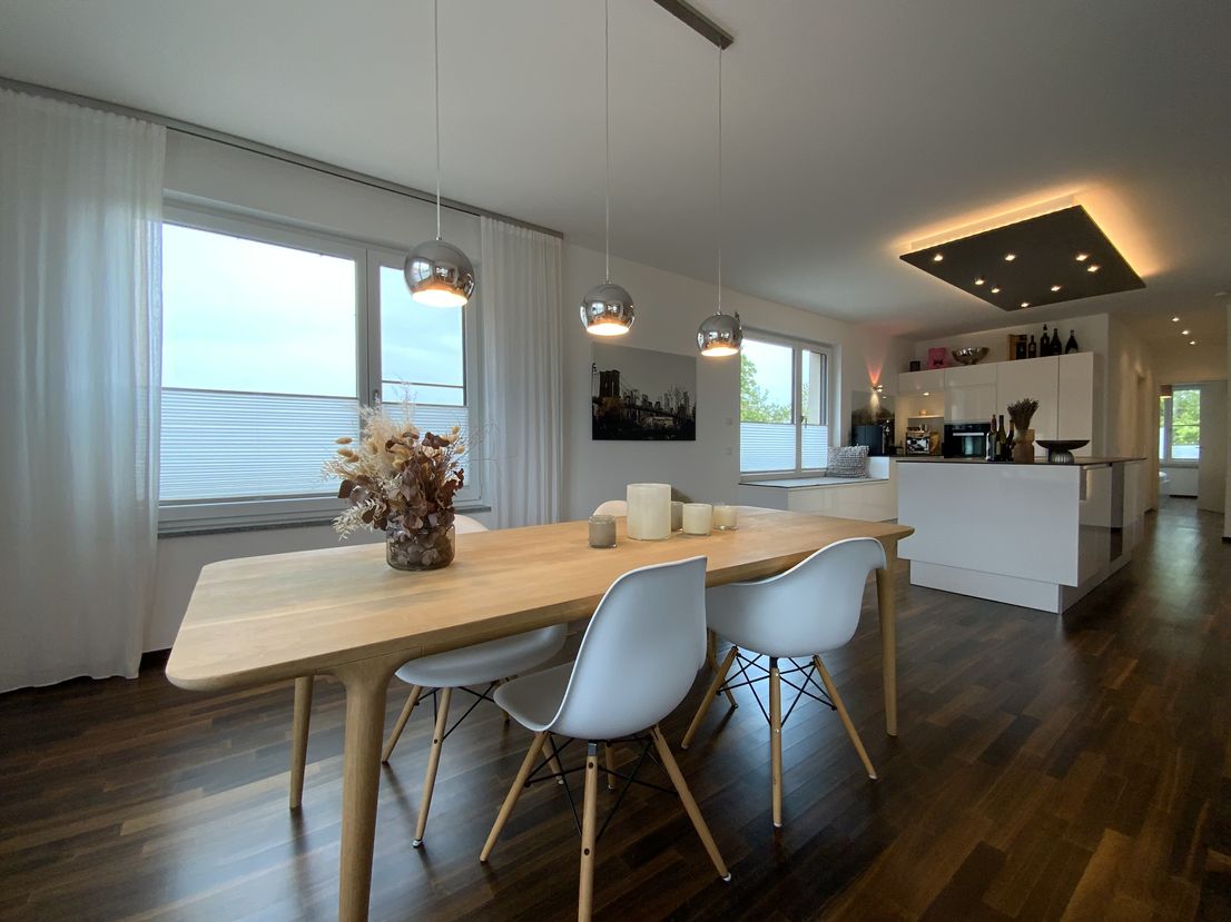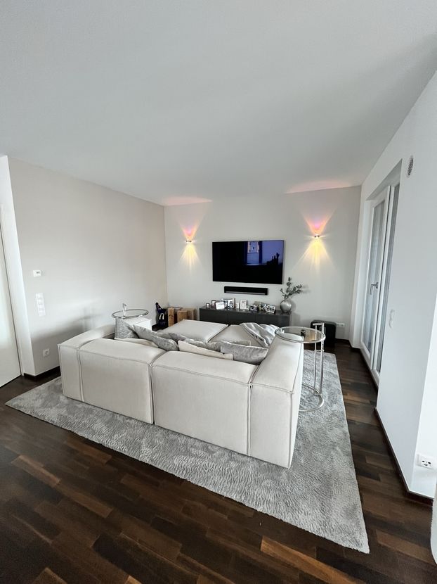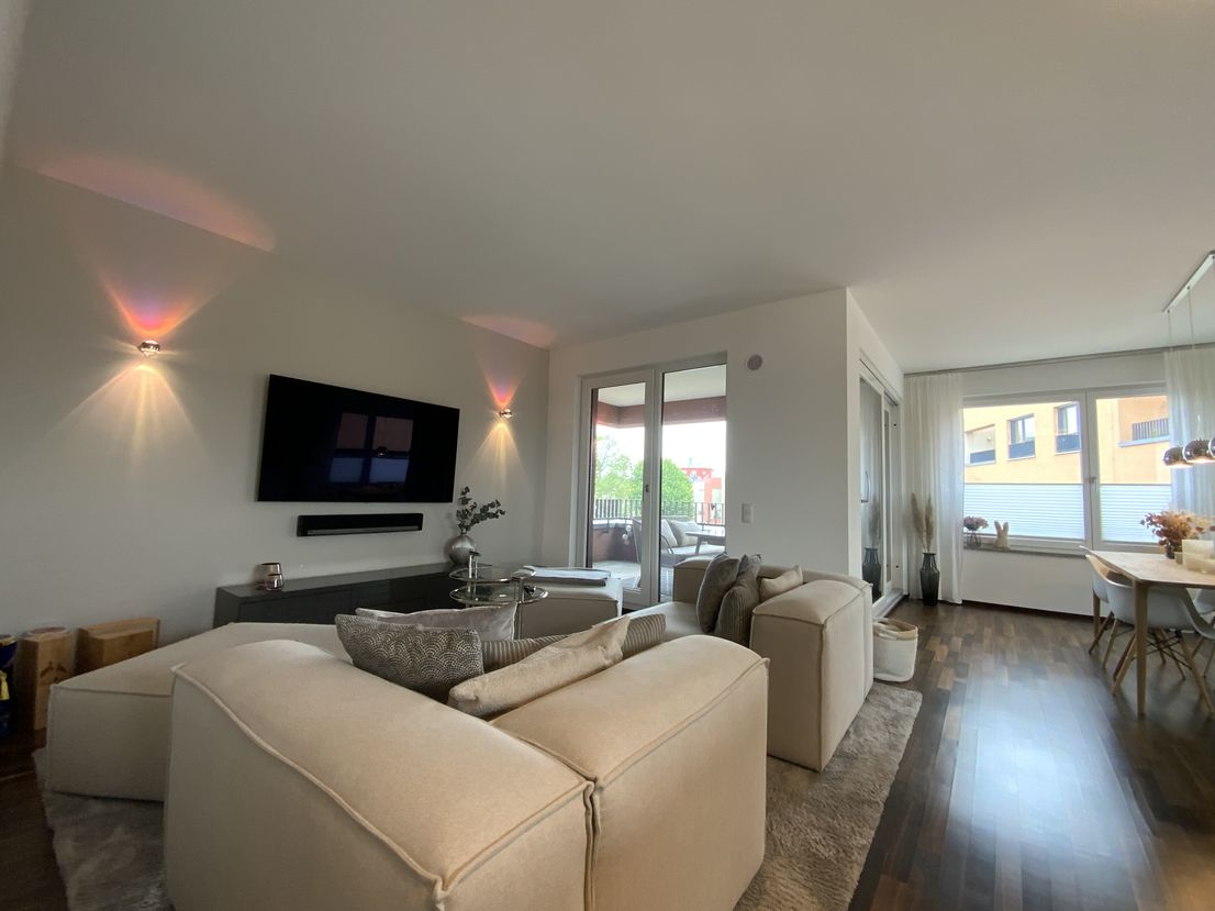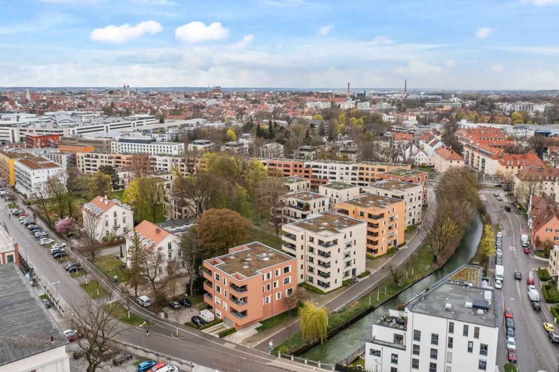 The "Am Provinopark" residential complex was newly developed in 2013 in Augsburg's traditional textile district. It is centrally located with good infrastructure and boasts beautiful green spaces. The meticulously landscaped park surrounding the apartments features mature trees. The idyllic Schäfflerbach stream completes the attractive landscape architecture. Very close to the city center and surrounded by nature. The apartment itself is located in the second row along the Schäfflerbach stream. The open architecture on all sides offers views of both the romantic stream and the green courtyard. Living in the park and living by the water!